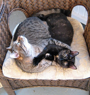 But here we see who is really in charge of kittyland. Julius always gets the loveseat on the front porch, while the lesser felines must squeeze themselves into a single chair.